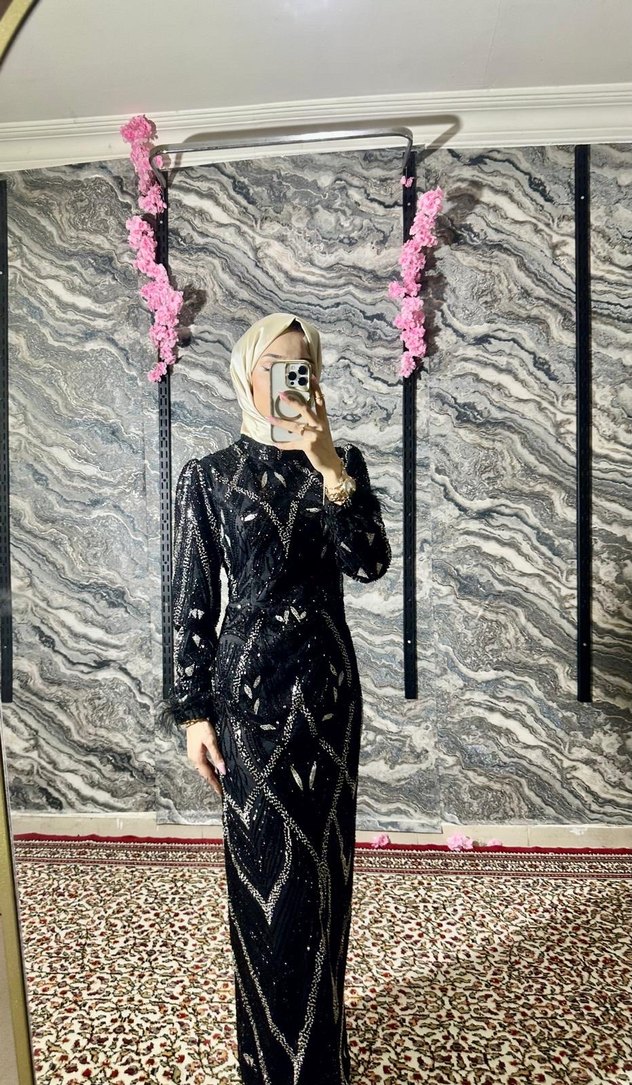 Yüksek yakalı, uzun kollu siyah uzun abiye elbise, payetli yılan deseni ile süslenmiştir. Düğün için uygun, düzenli kesim ve gösterişli, sade stile uygundur.