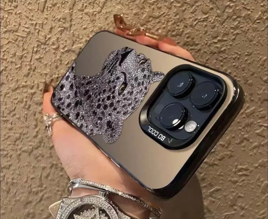 Koyu gri renkte, payet işlemeli leopar desenli telefon kılıfı, sokak stiliyle dikkat çekiyor.