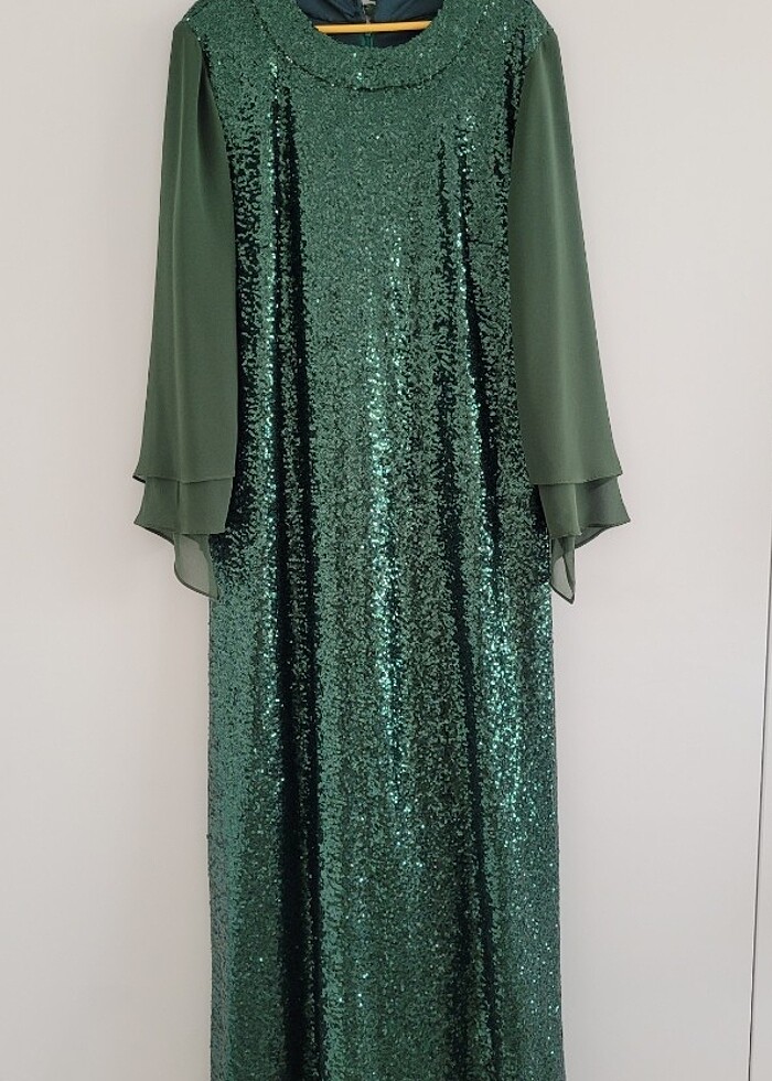 Yeşil payetli/pullu, kolları çift kat şifon abiye elbise. 46 beden. Ürün koltukaltı ölçüsü 54 cm, ürün boyu 145 cm. Temiz kullanılmıştır.