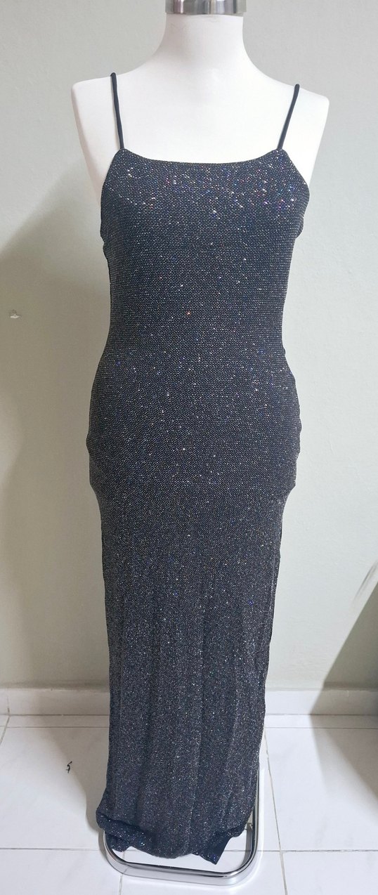 Payetli, uzun, kolsuz, tek renk gri abiye elbise. Tekneden kesim ve şık parlak detaylarla parti için uygundur. ✨