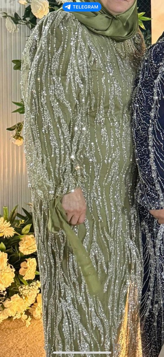 Payetli ve işlemeli desenlere sahip, uzun kollu, tekne yaka, vücuda oturan uzun abiye elbise. Düğünler için uygun parlak haki renk. ✨