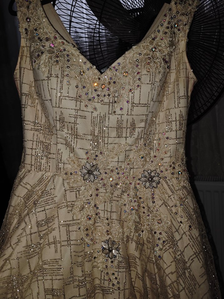 V yakalı, kolsuz, uzun ve vücuda oturan bej nişan elbisesi. Nakışlı desenler ve payet detaylarıyla vintage ve bohem tarzı bir arada sunar. Düğünler için uygun.