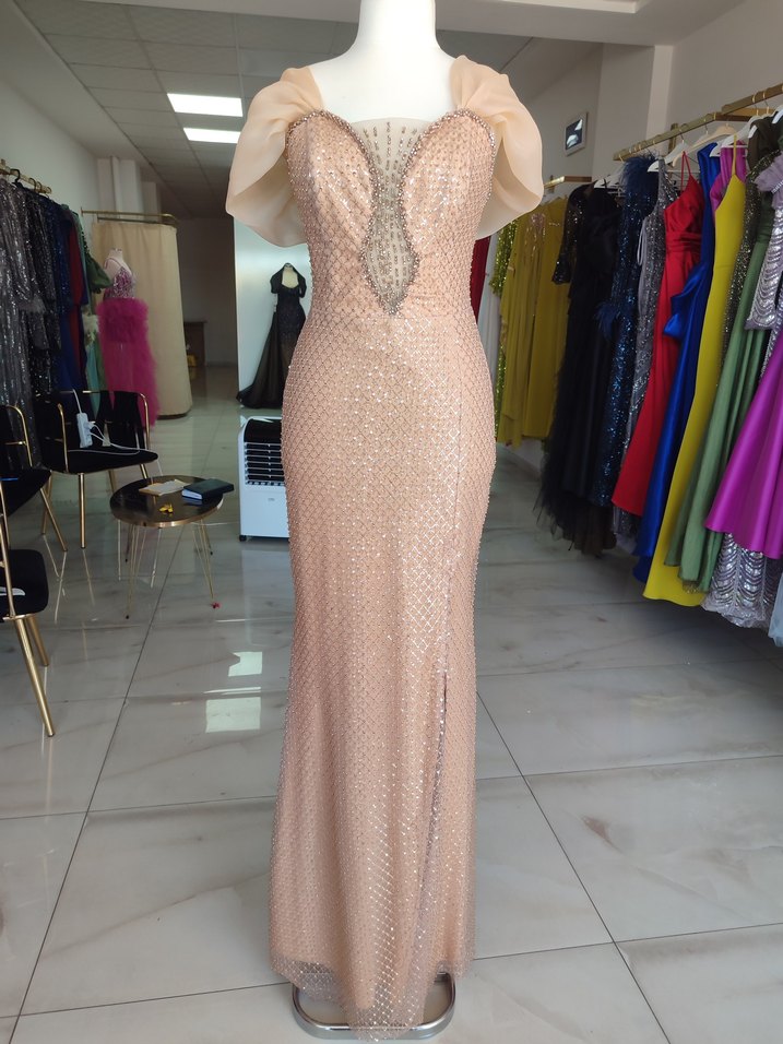 Payetli V Yakalı Bej Uzun Abiye Elbise