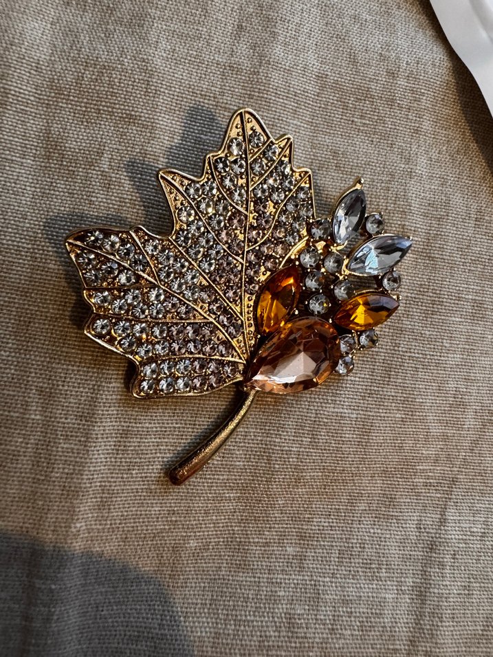 Payetli ve nakışlı kahverengi yaprak tasarımlı vintage broş, düğünler için bohem tarzda ve hafif canlı renklere sahip.