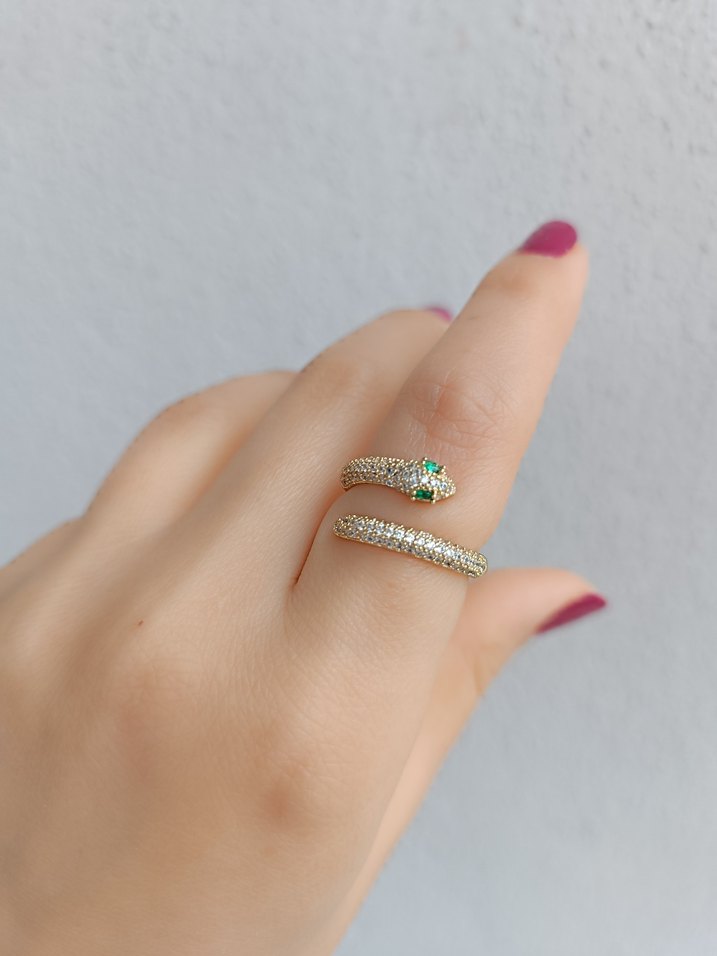 Taslarla süslenmiş yılan desenli, altın renkli kadın yüzüğü, cesur ve çağdaş tarzlar için düğünlerde kullanılabilir.