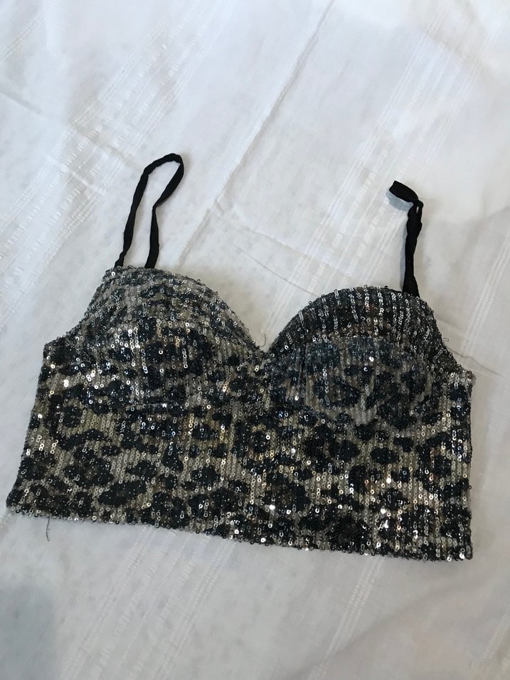 Payetli ve yılan desenli, ince askılı straplez, vücuda oturan gri büstiyer. Parti için uygun, cesur bir tarz sunar. ✨bedenleri mevcut.Gögüs pedli.Görsellerde Bedenleri ve ölçü tablosu var. MARKA TEMSİLİ