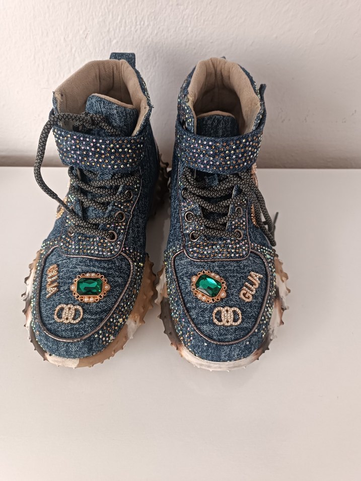 Payetli Yüksek Topuklu Mavi Denim Spor Ayakkabı - Görsel 1