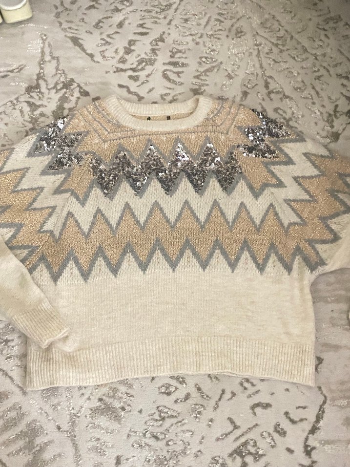 Bej renkli, uzun kollu ve yuvarlak yakalı bu triko kazak, nakışlı zigzag desenler ve payet detaylarıyla bohem tarzı sunar. Outletten aldım o yüzden etiket kesik Zara markadır temiz defosuz