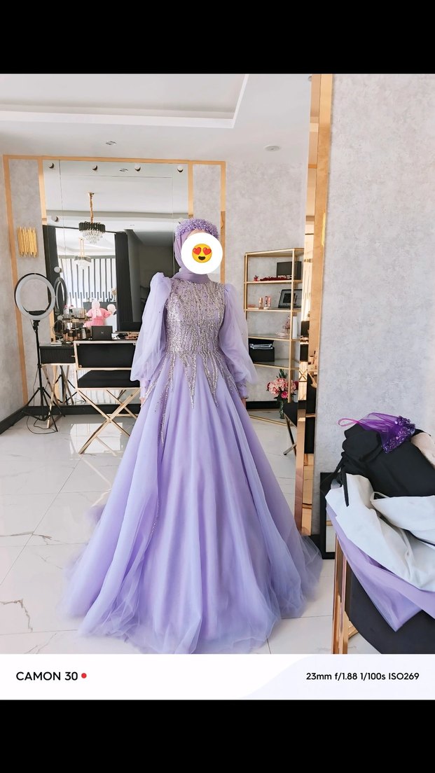 Bu açık mor nişan elbisesi, drapeli detaylara sahip dar kesim, yüksek yakalı ve uzun kolludur. Desenli, sade ve gösterişli gotik tarzda, uzun boyda düğün için uygundur.