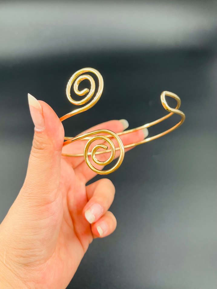 Parlak altın renkli, elastik ve minimalist spiral detaylı bilezik, bohem ve retro tarzıyla günlük kullanıma uygundur.