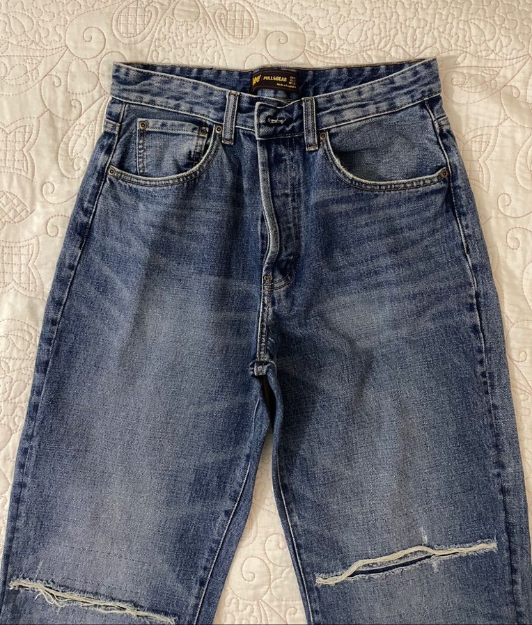 Kadınlar için bol kesim, midi boyunda, tokalı bel detaylı, desen içermeyen mavi-gri tonlarında denim kot pantolon. Günlük kullanıma uygun.
