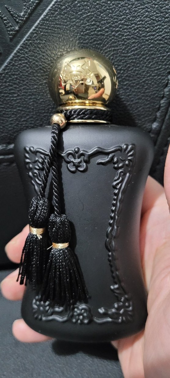 Şık kabartmalı detaylara ve boynunda dekoratif püsküllere sahip siyah mat kadın parfüm şişesi. Kapak parlak altın rengindedir.