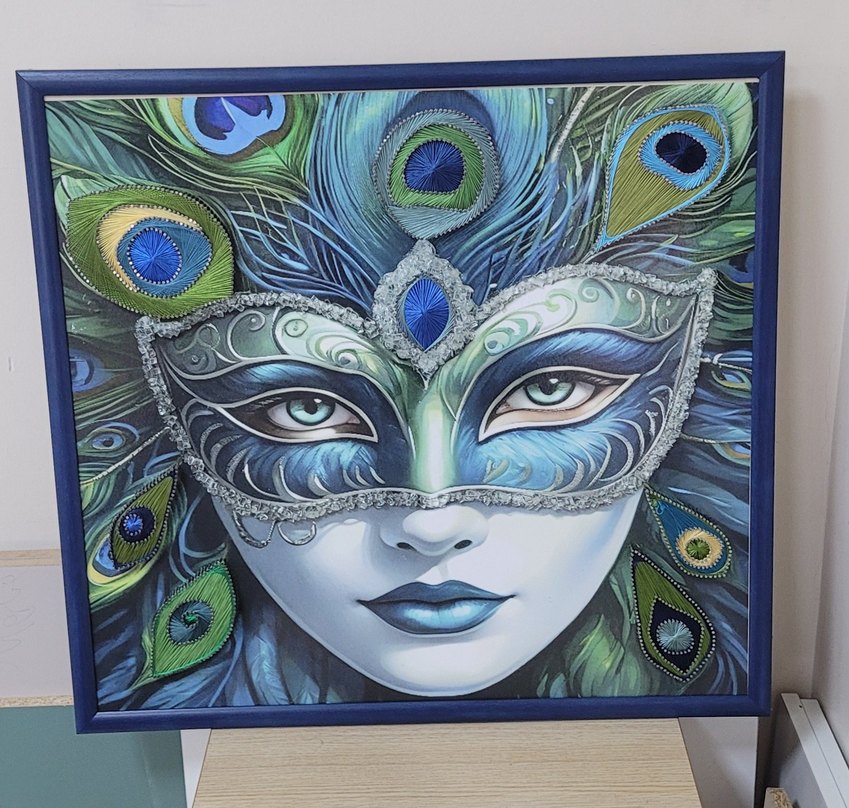 Mavi ve yeşil tonlarda, gümüş detaylı tüy desenli kadın maskesi. filografi sanatı el emeği