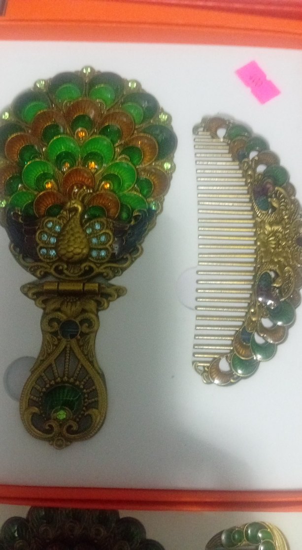 Yeşil ve altın tonlarında renkli taşlarla süslenmiş, tavus kuşu desenli saç fırçası ve tarak seti. Detaylı işçilikle nostaljik bir görünüm sunar.