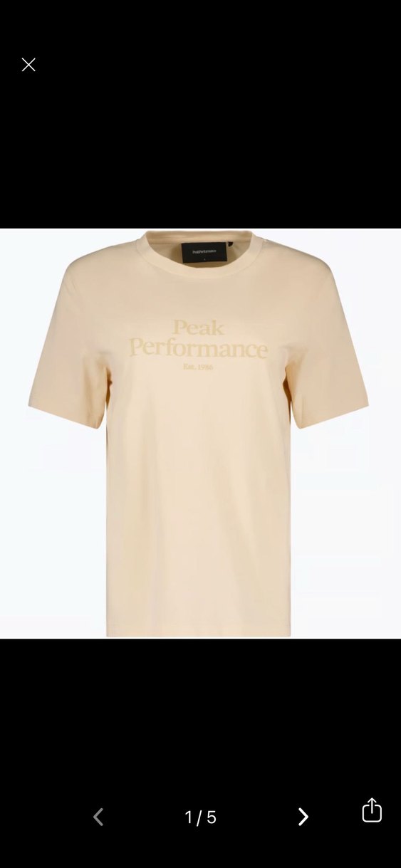 Bej renk, kısa kollu, yuvarlak yakalı kadın tişörtü. Sentetik kumaştan üretilmiş, rahat kesim ve 'Peak Performance' baskılıdır. Günlük kullanıma uygundur.
