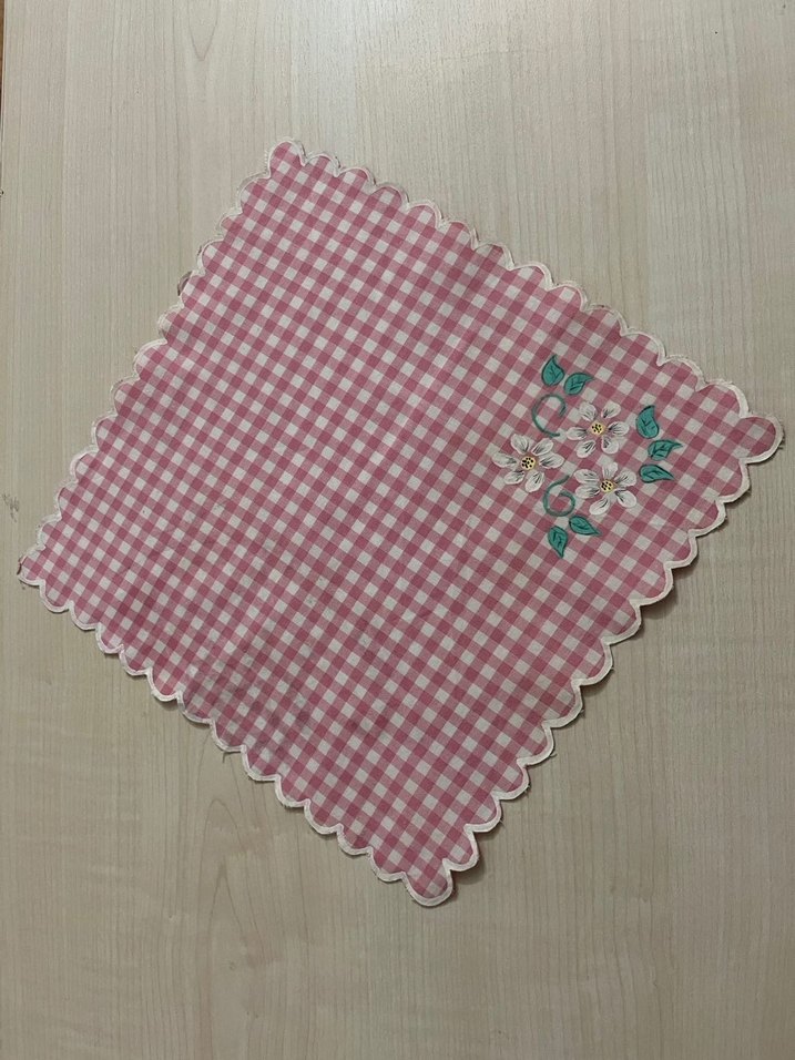 11 adet, pitikare kumaş üzerine kumaş boyası ile elde boyanmış, kenarları çerçeveli, az kullanılmış kare peçete- örtü. Boyutları 24*24 cm dir.