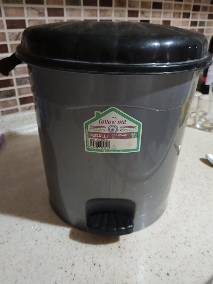 Follow'me markalı, siyah kapaklı ve gri gövdeli pedallı çöp kovasıdır. ️