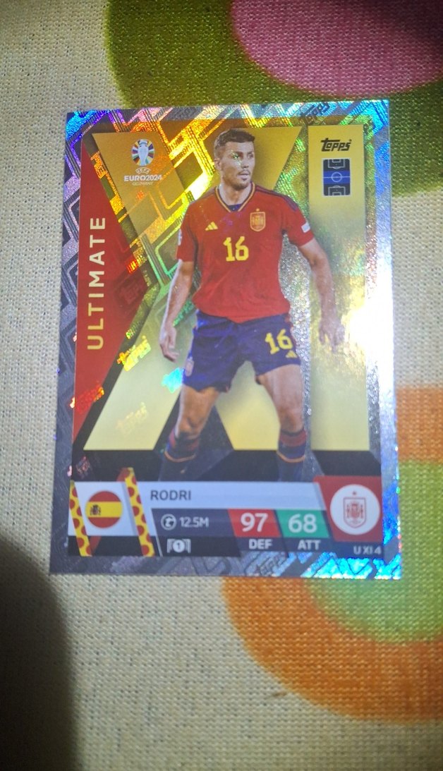 Futbolcu Rodri'nin istatistikleri ve holografik detaylarıyla koyu kırmızı erkek rozeti, pop kültür ve athleisure tarzında. ⚽