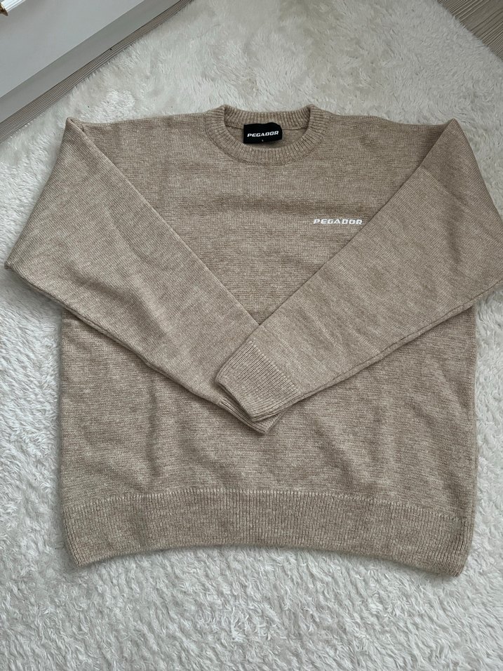 Bej renkli yün kazak, yuvarlak yaka ve uzun kolludur. Salaş kesimiyle günlük sokak stiline uygundur, sade ve rahat bir görünüme sahiptir.
