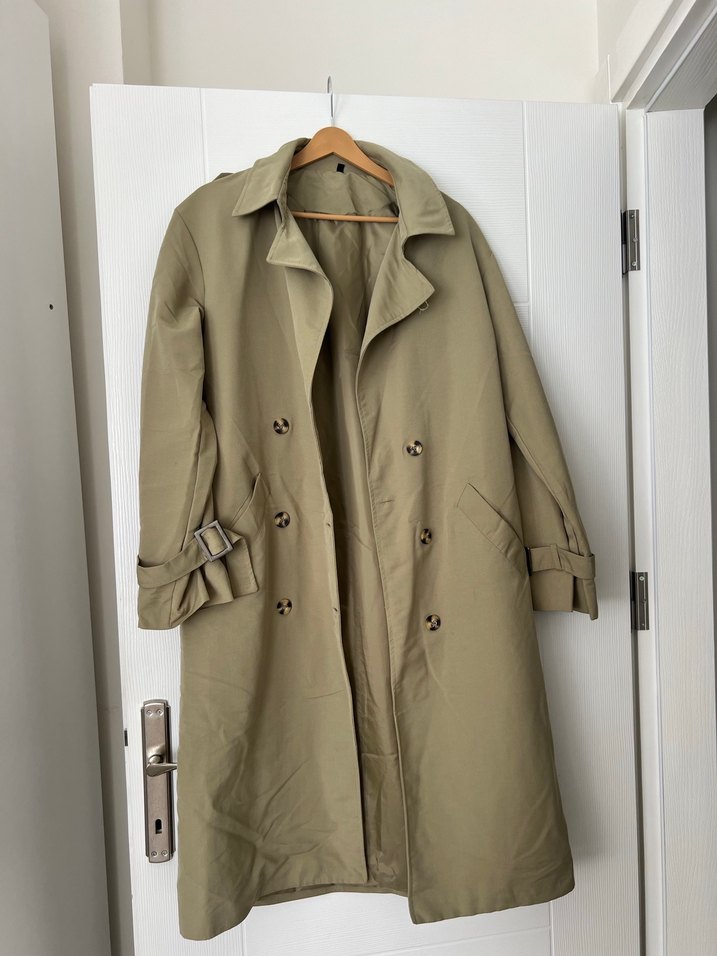 Haki renkli, uzun trençkot. Düğmeli ön kısmı ve kesik yaka detayı bulunur. Uzun kollu, bol kesim, desen içermeyen sade tasarım. Günlük kullanıma uygundur. Kemerini kaybettiğim için satıyorum çok az kullanıldı herhangi bir kusuru yok bir 63’ün benim diz altımda bitiyor gayet uzun.