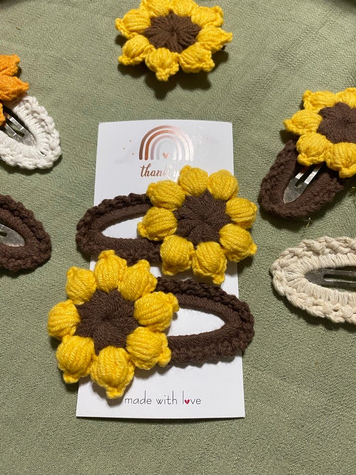 Sarı renkli, örgü ve çiçek desenli renkli ayçiçeği toka 6cm lik metal çıt çıt tokalar üzerine koton iplerle örülmüş yumuşacık tokalarımız ikili set halinde satılmaktadır.