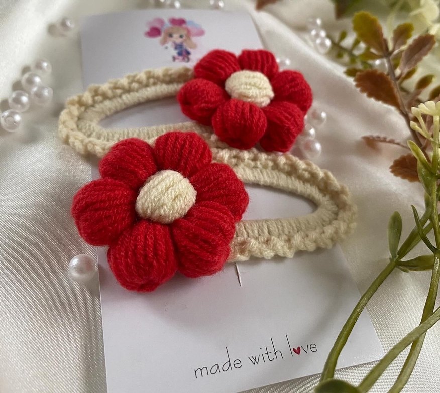 Pelamira, pofuduk papatya serisi kırmızı papatya rengi ile yumuşacık dokusuyla sizlerle.  6 cm metal çıtçıtlı toka üzerine koton iplerle sevgiyle örüldü özenle hazırlandı. Nakışlı kırmızı çiçeklerle süslü, bej merkezli örgü çocuk saç tokaları. Bohem tarzda, sevgiyle yapıldı.. .