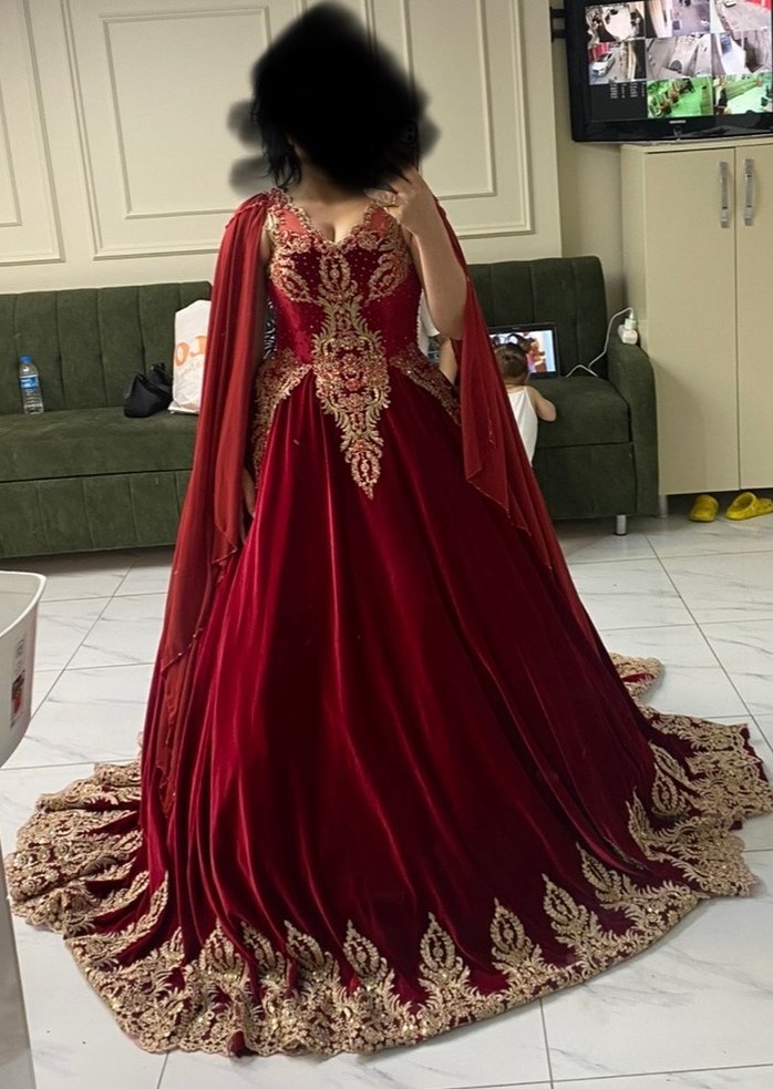 Bordo, işlemeli ve drapeli klasik kına elbisesi. Parlak kumaş ve fit kesimiyle gotik şıklık sunar.