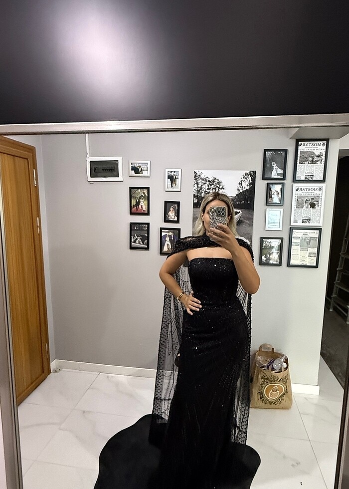 1 kez giyildi pelerin potatiftir istediğiniz zaman çıkar . Full boncukludur Ek olarak kolluk yaptırdım kendim .
