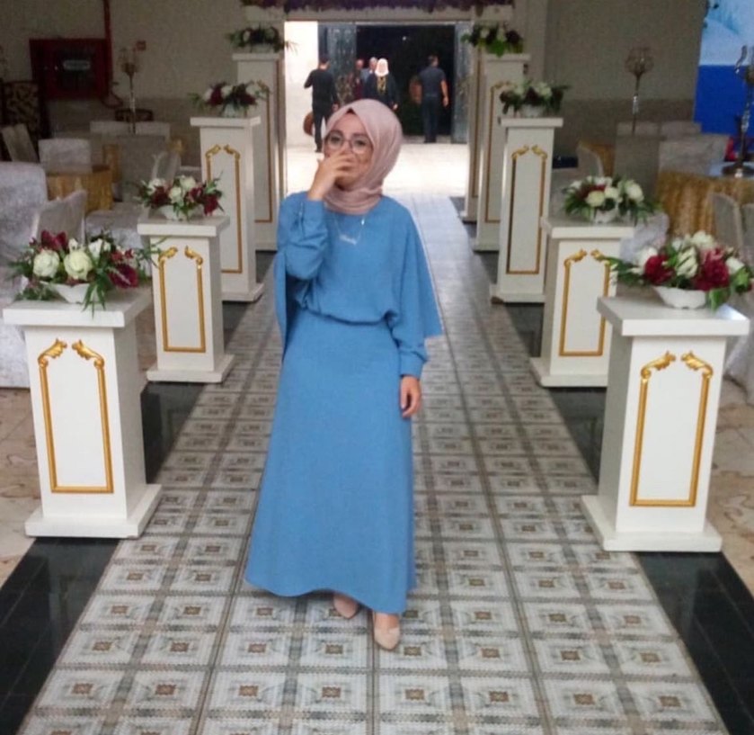 Pastel mavi renkte, uzun kollu ve yüksek yakalı, salaş kesim kadın elbisesi. Günlük kullanıma uygun, rahat sentetik kumaştan, minimal sokak modasına uyumlu.