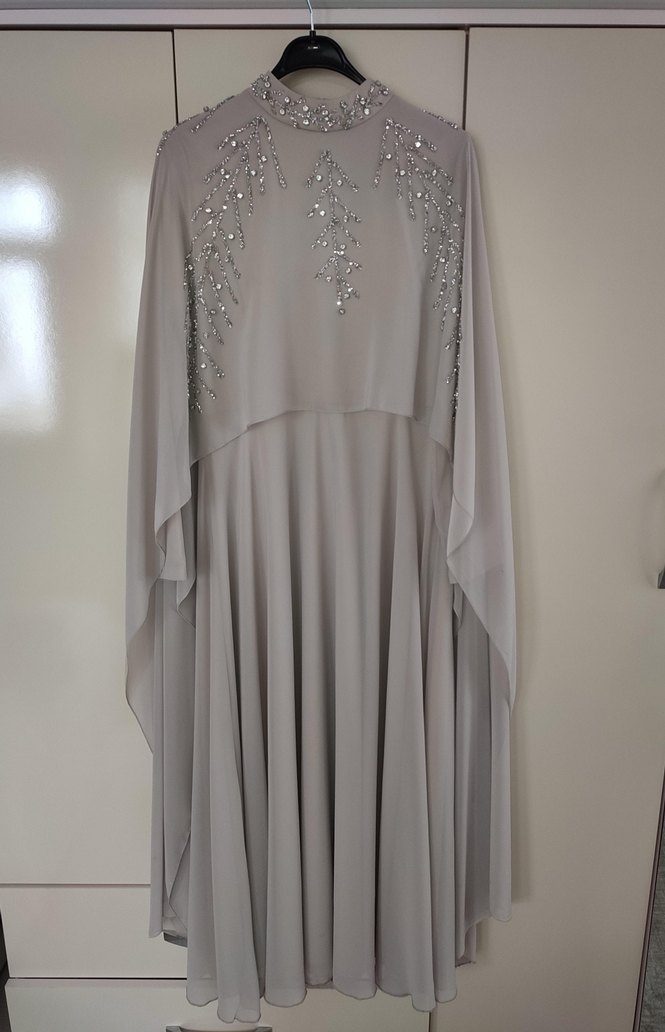 Annem 1 kere giydi daha da giymedi. Güzel şık bir abiye. 44 beden Bu uzun bej abiye elbise, drapeli tasarımı, yüksek yakası ve uzun kollarıyla dikkat çeker. Nakış detayları ve bol kesimiyle düğünler için uygundur.