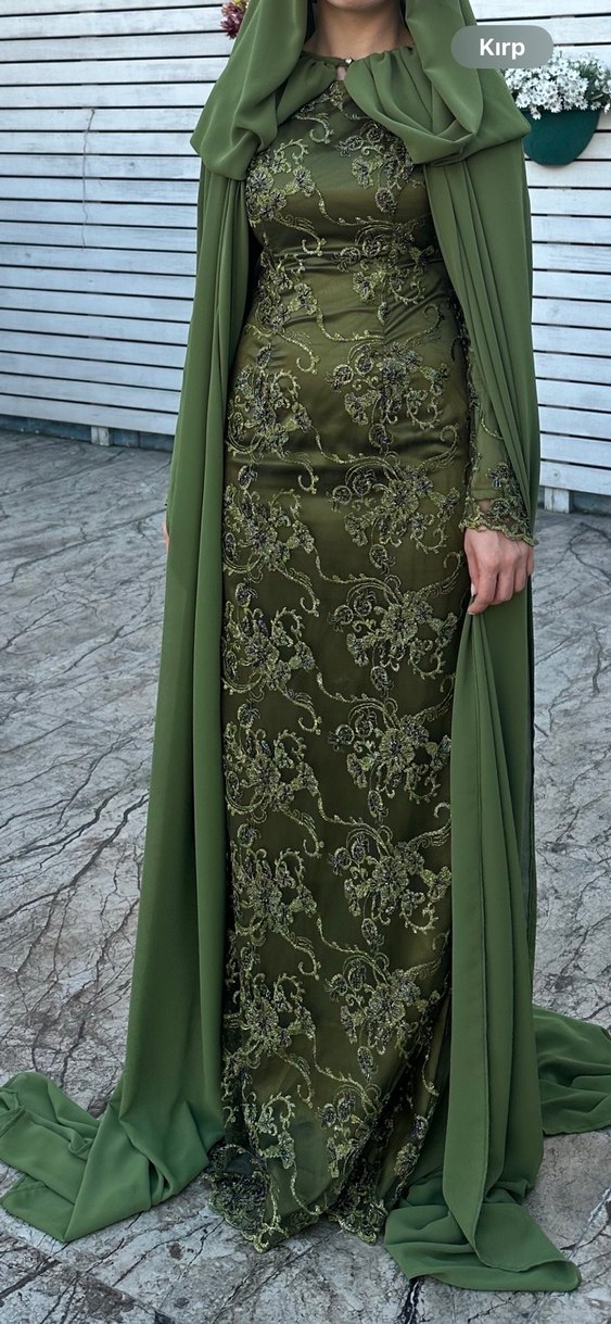 Bir kere giyildi, ful astarlı pelerinli özel dikim kına elbisesi, bel 32, boy 148 cm