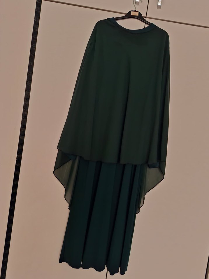 büyük Beden kadın elbisesi pelerinli 1 kez giyildi koyu yeşil renginde 145 cm likralı esnektir