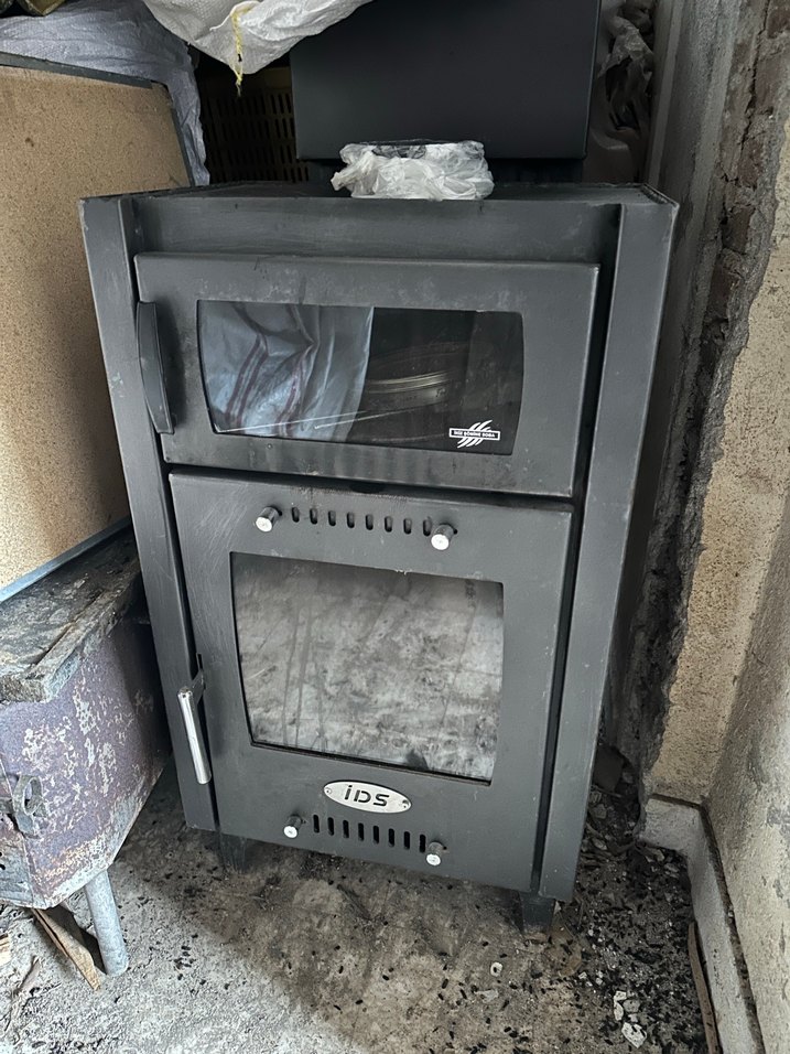 İki cam kapaklı, metal kulplu siyah katı yakıtlı ısıtıcı soba. Isıtma ve pişirme için uygun pelet haznesi arka taraftadır
