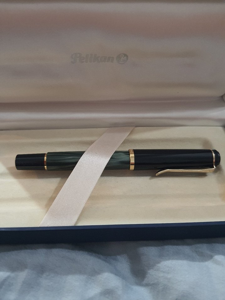 Pelikan markalı siyah gövde ve altın detaylara sahip vidalı kapak dolma kalem, klasik kutusunda sunulmaktadır. ️Sifir ve hiç kullanilmamistir Uç 18 k altin