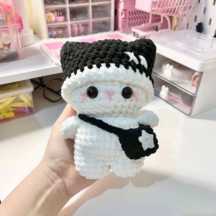 El yapımı peluş oyuncak, yumuşak beyaz vücut, siyah şapka ve yıldız detaylı küçük siyah çanta ile. Yuvarlak gözler ve pembe yanaklarıyla sevimli görünüyor.