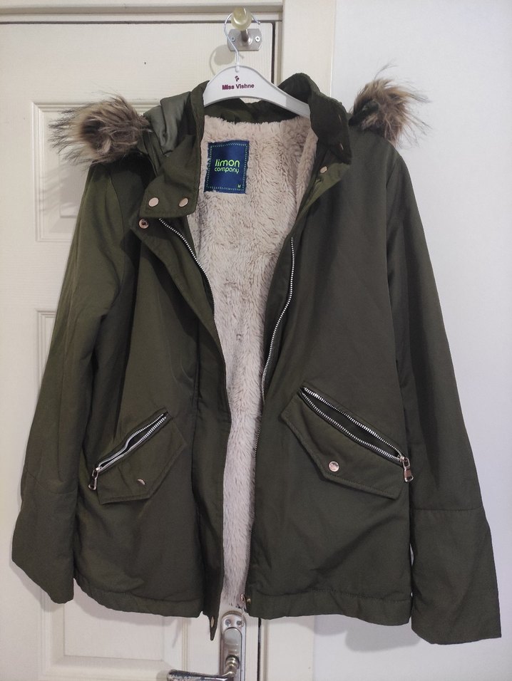 Yeşil kadın mont, bol kesim, yakalı ve uzun kolludur. Peluş astarlı iç kısmı ve fermuarlı cepleri ile dış mekan kullanımı için uygundur.
