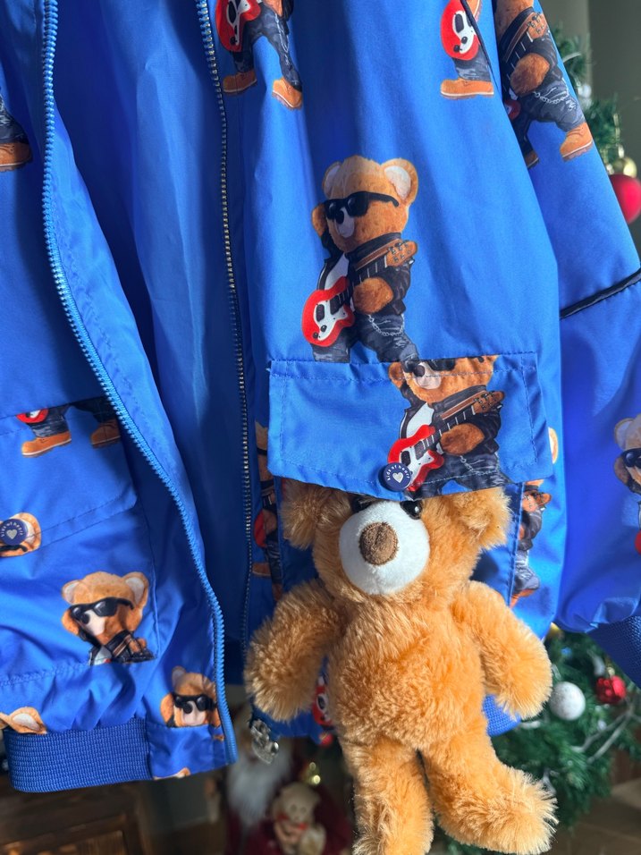 Renkli mavi ceket, gitar çalan ayı desenleri ve yumuşak kahverengi peluş ayı oyuncak ile süslenmiştir. 6/7 yaş için çok temiz çok az giyilmiş kids of heart marka erkek çocuk ince mevsimlik mont.