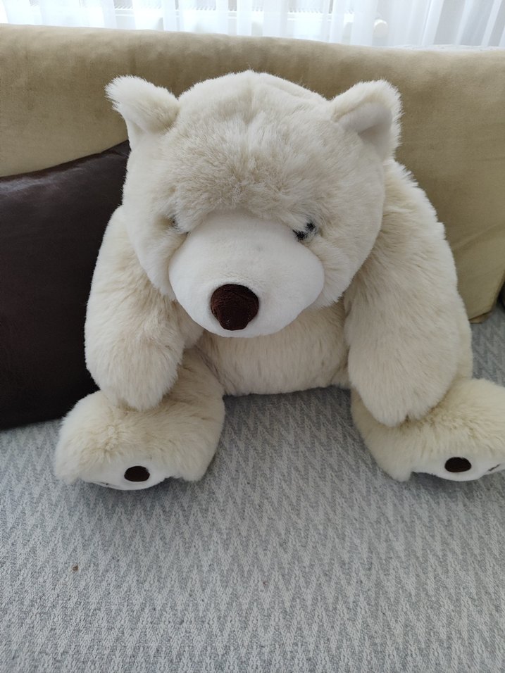 Yumuşak ve kabarık krem rengi peluş ayı oyuncak, detaylı özelliklere sahip, sarılmak için uygun. 90 cm boyu 70 cm eninde