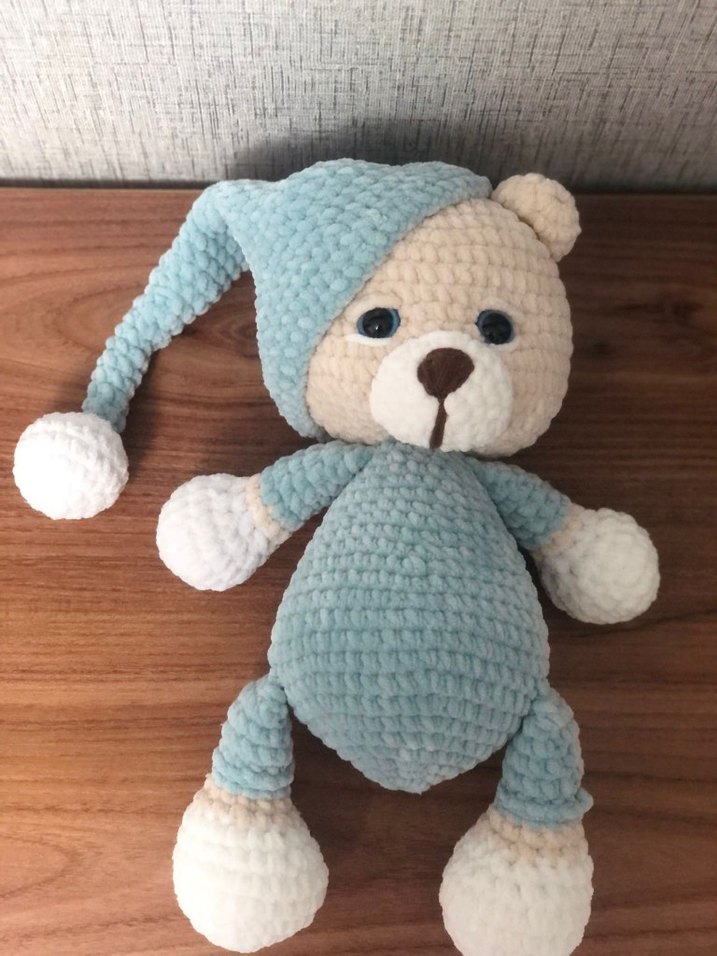 Pastel gri ve krem renklerde yumuşak peluş ayıcık, uzun şapka ve ponpon ile. Sarılmak ve dekor için uygun. bebekler için organik uyku arkadaşı #uykucu #uykuarkadaşı #peluş #elemegi #oyuncak