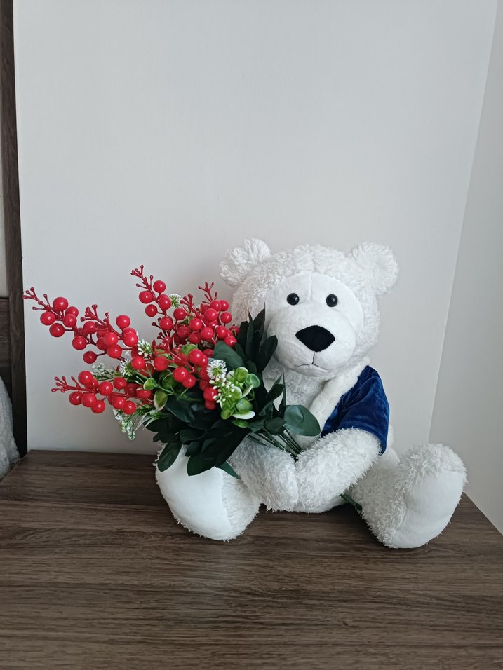 Mavi yelek giymiş beyaz peluş ayıcık kokina çiçeği getiriyor #yilbasi #yeniyil #ayi #pelus #sevimli #hediye
