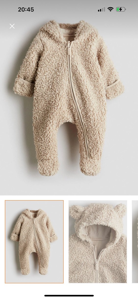 Yumuşak ve sıcak kumaştan yapılmış bej bebek tulumu, kürk detaylı ve ön fermuarlı. Desensiz sade tasarıma sahip, ayaklı model.