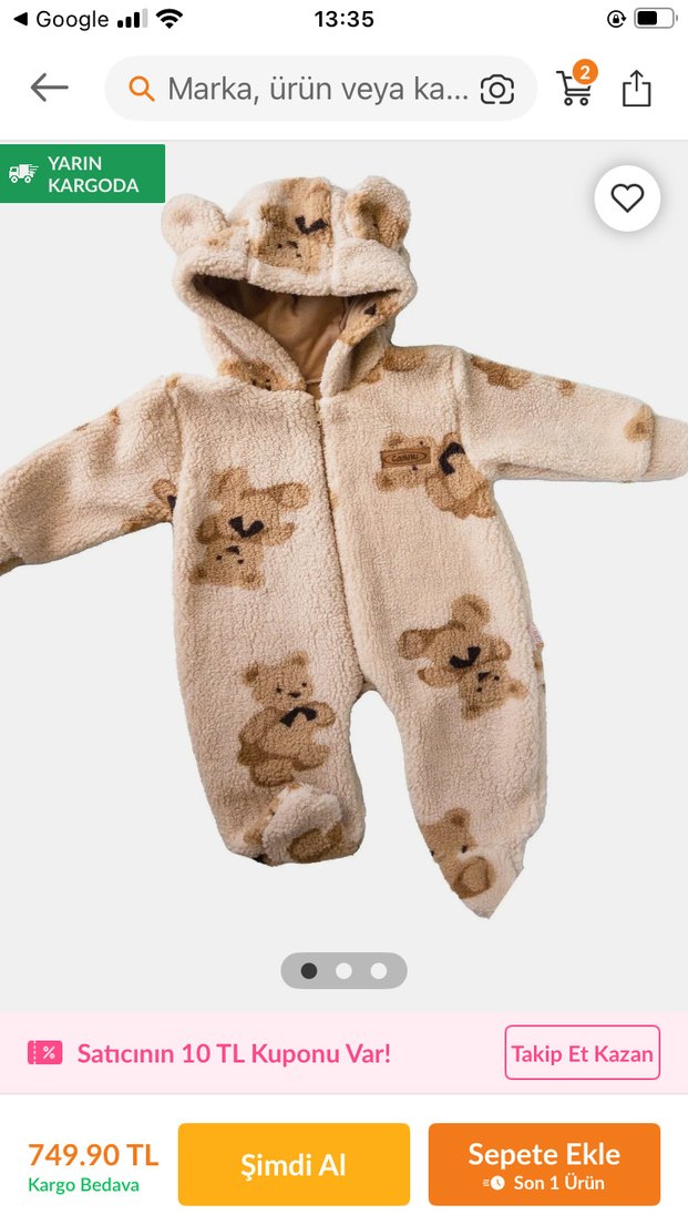 Kahverengi ve peluş kumaştan yapılmış, kulaklı kapüşonlu ve kürk detaylı bebek tulumu. Sokak stili için uygundur. 6/9 ay hiç giyilmedi