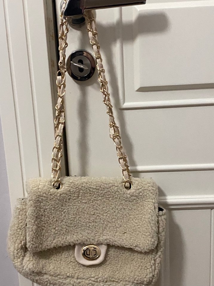 Yumuşak ve sıcak dokulu kumaştan yapılmış, zincir detaylı askıya sahip kadın çantası. Bohem tarzda, açık gri renkte, günlük kullanıma uygun. Metal tokalı kapaklıdır.