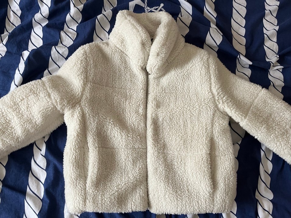 Yumuşak ve sıcak kumaştan, beyaz renkli, yüksek yakalı, uzun kollu, peluş kadın ceket. Düz ve rahat tarzda, günlük kullanıma uygundur. Fitted kesim ve normal boyda. hiçbir sorunu yoktur. sıcacık tutuyor