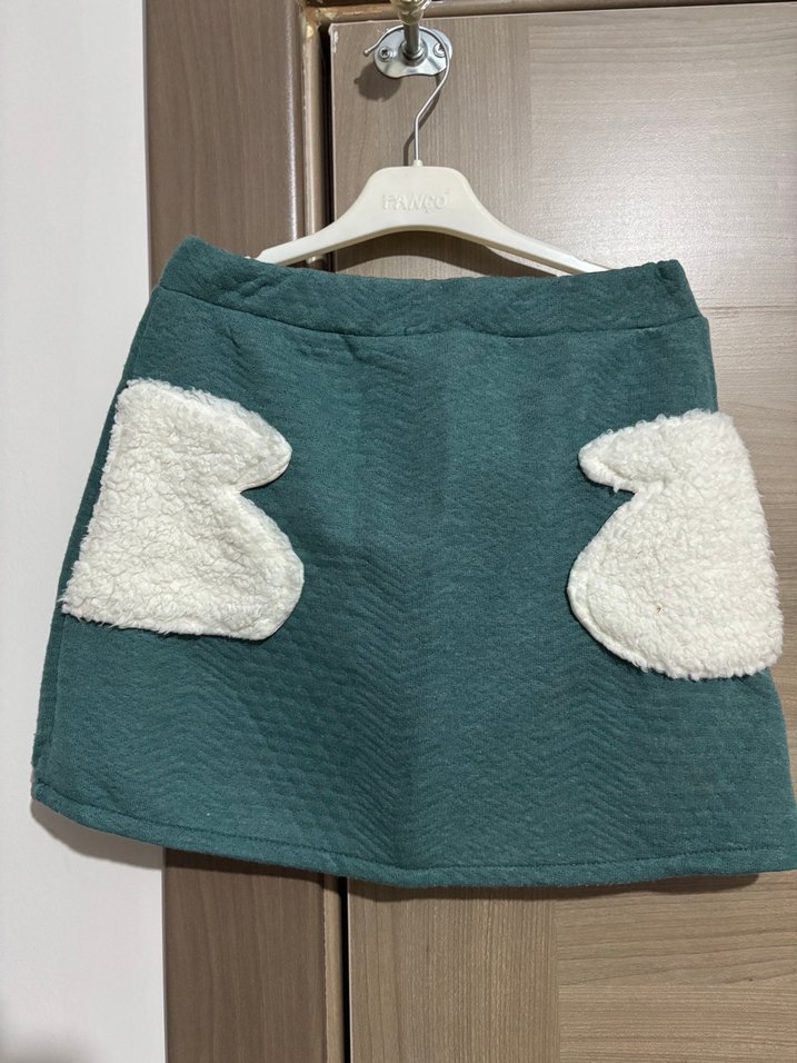 Yumuşak ve rahat kumaştan, bol kesim yeşil etek, beyaz peluş ceplerle tamamlanmıştır. 9-10 yaş uygundur