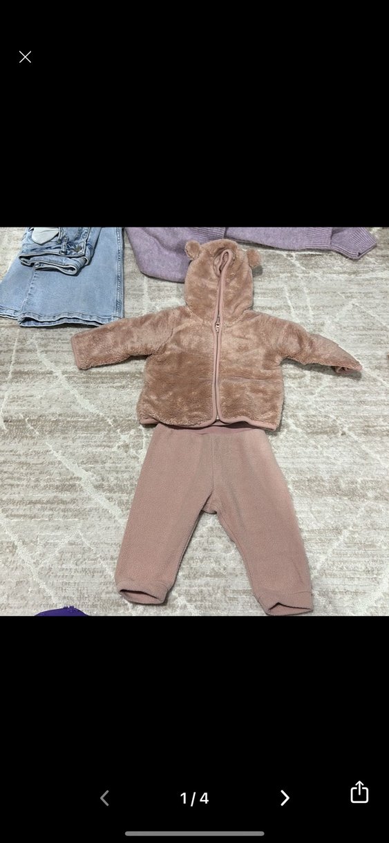 peluş detaylı uzun kollu kapüşonlu ceket ve yumuşak kumaştan eşofman altından oluşan bebek kız takımı.