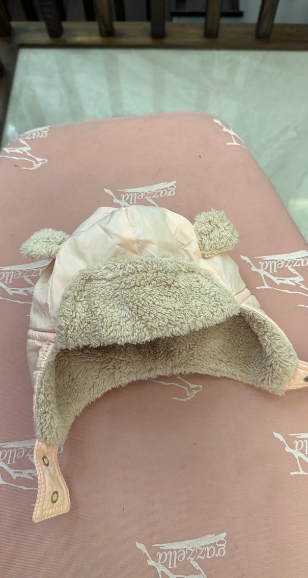 Peluş detaylı, kulaklıklı bej çocuk bere. Pastel tonlu, nakışlı ve sokak stili. İç kısmı yumuşak ve sıcak tutar.