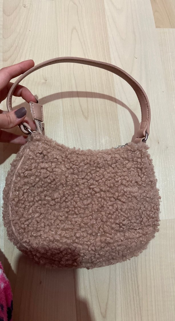 Peluş detaylı, bej renkli, yumuşak dokulu kadın çantası, rahat sapıyla günlük kullanıma uygun sokak stiline uyum sağlar.
