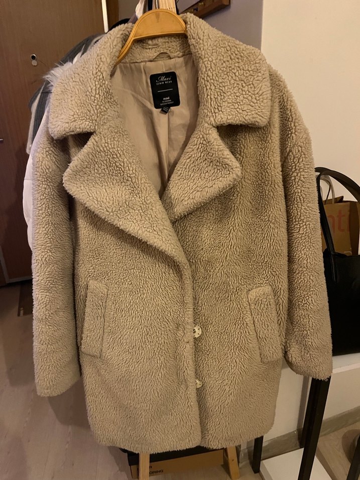 Peluş detaylı, bej renkli midi uzunlukta, bol kesim ve uzun kollu kadın kabanı. Notlu yaka tasarımına sahiptir, günlük rahat kullanım için uygundur.
