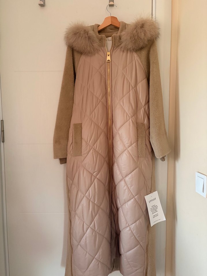 Peluş Detaylı Bej Uzun Kadın Kışlık Mont